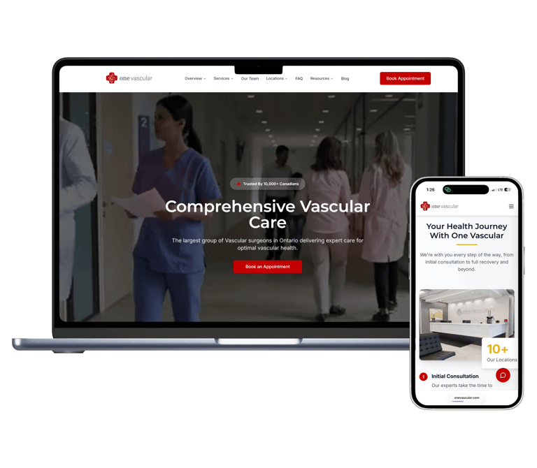 One Vascular is a multi-location vascular clinic providing advanced diagnostic imaging, specialist consultations, and minimally invasive venous treatments. Our work focused on building a clear, trustworthy patient journey that educates patients, supports referring clinics, and strengthens local visibility as the clinic continues to expand across Ontario.